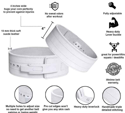 Our powerlifting lever belt features 10mm thick, solid, genuine leather with a fine suede finish for a non-slip surface. This thickness offers maximum support while maintaining flexibility. Introducing our upgraded lever buckle with a sleek chrome finish, replacing the previous black lever. This buckle is crafted from top-notch materials, ensuring it is nearly indestructible and highly resilient. Investing in our belt means committing to quality and reliability, allowing you to train without equipment concerns.